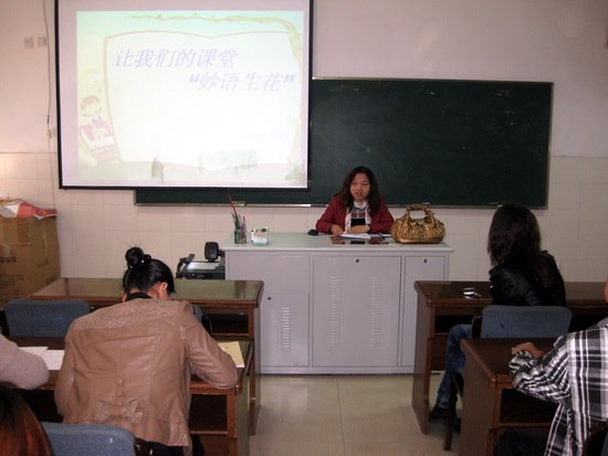 活动分两个环节,首先由仇老师做英语课堂用语方面的讲座----“让我们的课堂妙语生花”,仇老师从几节公开课的教师课堂用语谈起,结合我片教师教学实际,阐述了小学英语课堂用语的使用目的.小学英语课堂用语的基本原则和方法.小学英语课堂用语分类及特点,并结合实例和大家一起探讨了小学英语课堂用语使用中的常见问题及对策.如何更好地使用英语进行课堂教学,力求做到: Using English to explain English.Speak English if possible,speak Chinese if necessary.