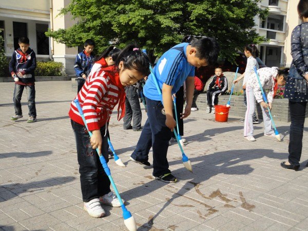 下午两节课后,马小校园多彩多姿的兴趣活动就展开了,您见过在地面上泼墨挥毫的人们吗?昨天,南田少儿书画社的小社员们真切地体会了一次大地当纸泼豪情的感觉。