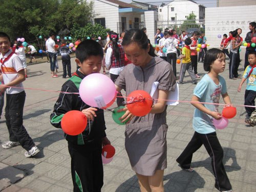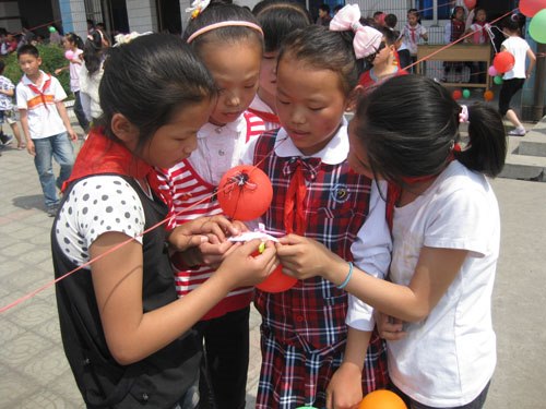 惊喜三:一场热闹非凡的猜谜游艺活动。一只只五彩缤纷的汽球,一条条新奇有趣的谜语,学校老师们为同学们布置出了一个五彩斑斓的“球”谜大世界。同学们在看完电影后纷纷涌向操场,争先恐后地奔向了汽球,猜起了上面的谜语。一张张可爱的笑脸上的表情顿时丰富起来。有的皱起了眉头冥思苦想,有的猜出了谜语暗暗高兴,大多数同学因为得到了气球和奖品欢呼雀跃起来。孩子们的眼中闪烁着兴奋的光芒。