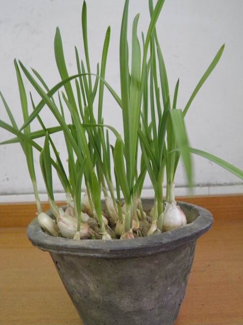说起这两盆大蒜,还有一个实验呢:一盆是剥开的蒜头,种在松土里;另一盆是整个的大蒜,种在有点粘的土里。我们是想看看,哪种大蒜发芽快,长得快。