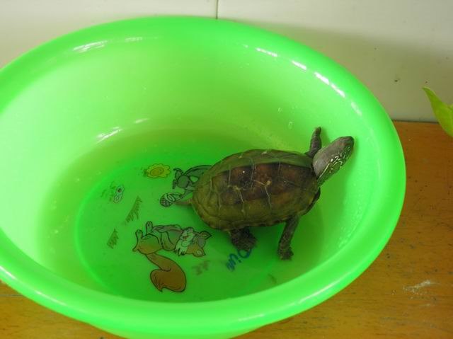 我们班的生物角又多了一名成员——一只小乌龟。听王远说,它是野生的,只吃活虾呢!它与宠物龟大不相同:头两侧没有橙色的斑,鼻孔有点上翘,像小猪的鼻子,背甲是比较凸起的,颜色棕褐,由六边形“拼”成,一条小尾巴不停地摆来摆去的,可爱极了。它被带来后十分不安份,连我们上课都要捣蛋——不停地用爪子搭在盆子的边缘,然后再滑下来,发出“嗒嗒”的响声。嗯,或许是在抗议把它关在盆里吧。它特别爱玩,不时张开嘴想咬自己的尾巴,所以老在盆里直打转。这时,只要你敲一下盆壁,它马上就会把头和脚都缩回去。过了一会儿发现没动静了再伸出头来,“恶狠狠”地盯着你,好像在说:“你为什么吓我呀?啊?小心我咬你!”我们每每看到这一幕,都被逗得哈哈大笑,它自然成了我们的“开心果”。希望它能一直陪着我们,我们一定会好好照顾它的!(牛志远)