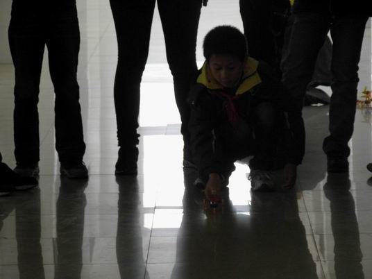 F1场地虽然占地小、竞赛用车体型也很小,但丝毫没有减退同学们的参赛热情,你瞧,场外攒动着一个个观望的小脑袋,都在关切地关注着比赛的进程。