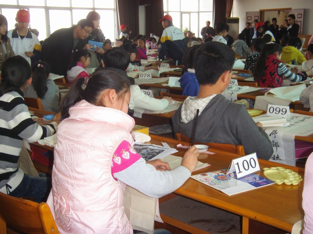 我校南田书画社5位小社员参加了上午第一场次的比赛。虽然我校这次参赛的五位小社员有的是首次参加这样级别的比赛,但他们仍能表现得从容不迫。特别是吴帆同学,她的参赛内容多达81个字,要在一小时之内写完并落款盖章,需要极大的勇气和定力。这个时候,平时的认真练习帮了大忙。在赛场上她做到了沉着镇定,一丝不苟。她的作品得到了评委的高度评价和肯定,获得了首场比赛120人中的最高分,位列第一。杨佳同学也不甘落后,紧紧跟随,位列第二。