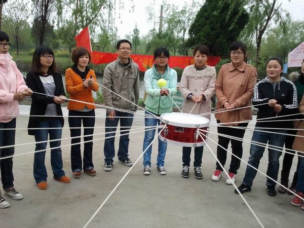 其中拓展活动主要采用游戏的形式,包括解手扣、电流传击、拉鼓击球、急速60秒、真人CS等活动,旨在发掘教师团队的智慧,享受成功的喜悦,强化团队意识。一到溱潼拓展基地,教师们不顾雨后的春寒,以极大的热情投入到了拓展活动中。在教练的指导下,很快所有教师完成了破冰,组建了两支团队,并分别选取了个性化的队名、队歌和队徽,然后开始挑战一个个高难度的任务。由于本次活动女教师居多,教练也特意安排了以团体智慧为主、体力消耗为辅的活动,有最需要集体智慧的“急速60秒”,最不可思议的“电流传击”,最累人的真人CS,最具喜剧色彩的“我是大茶壶”。一个个的挑战,教师们都非常投入与喜欢,在挥洒智慧与汗水的同时,充分享受着幸福的生活。