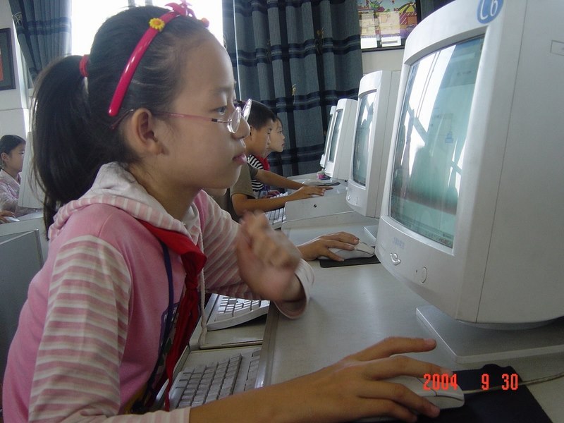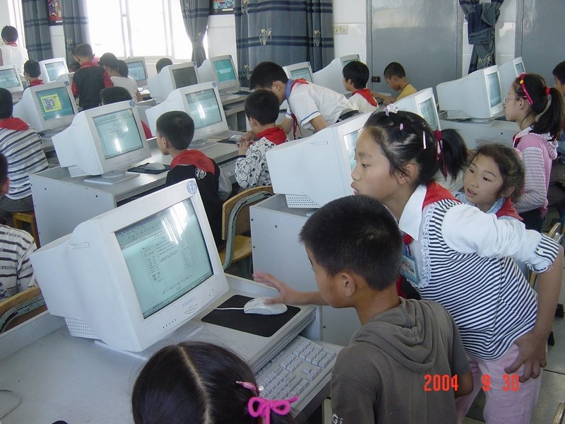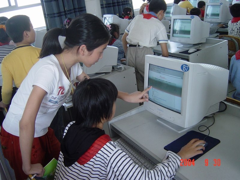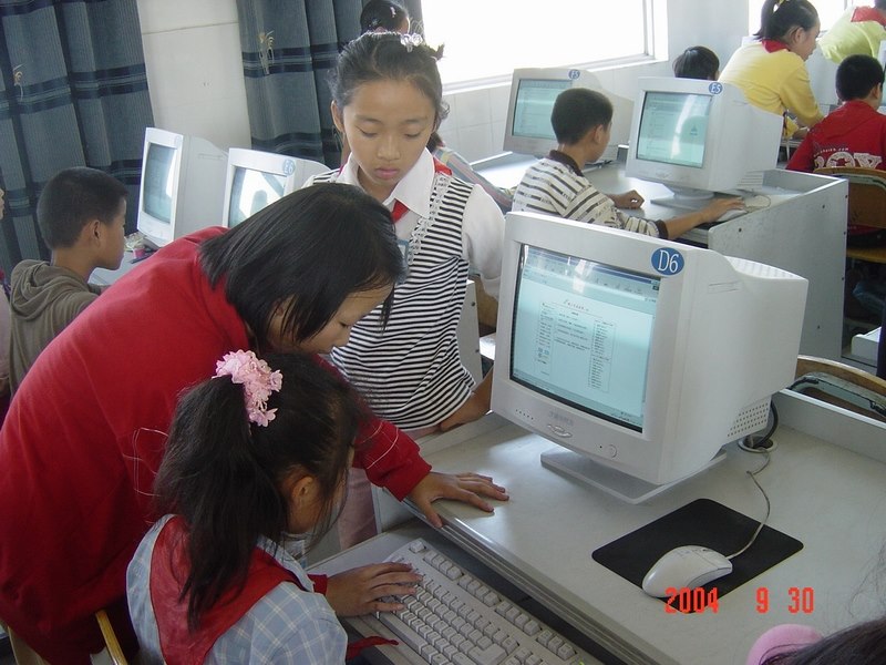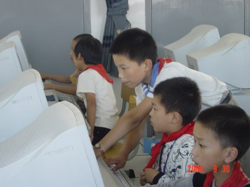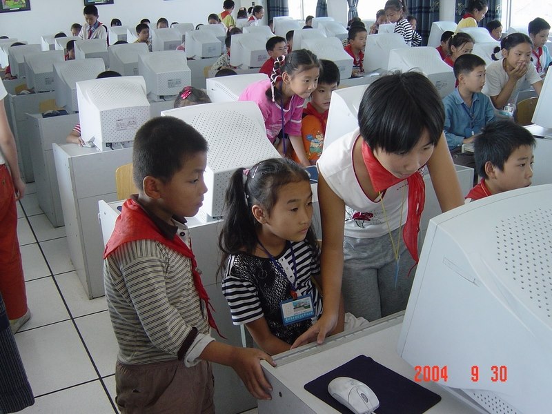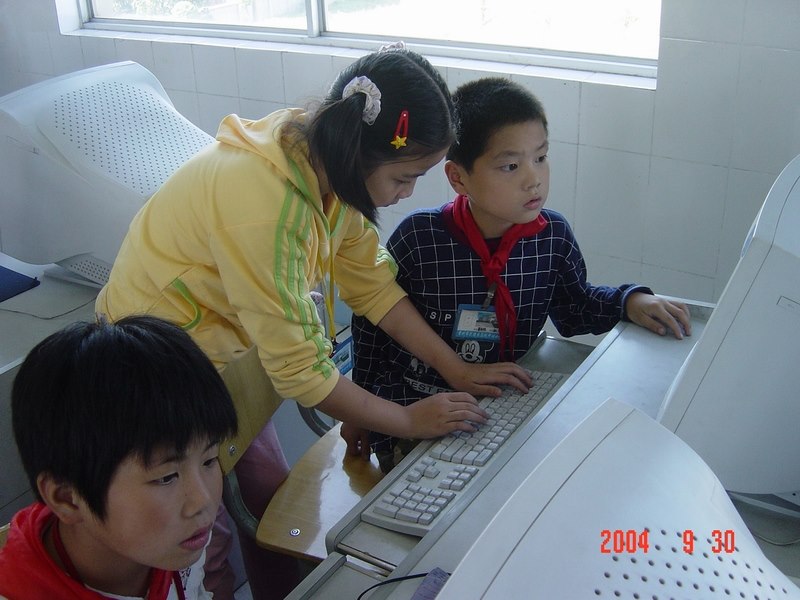 2004年9月30日,马杭中心小学的队员们用特殊的方式欢庆祖国母亲的生日:参加网上《爱国知识》考试。