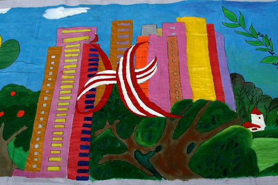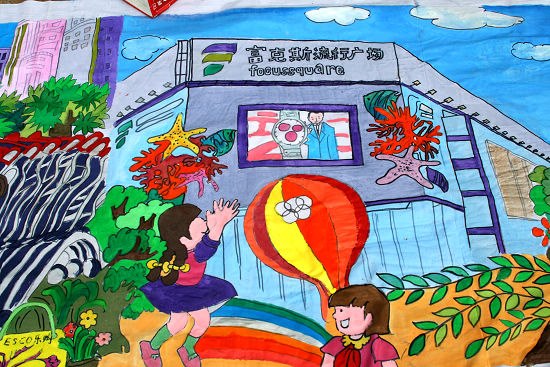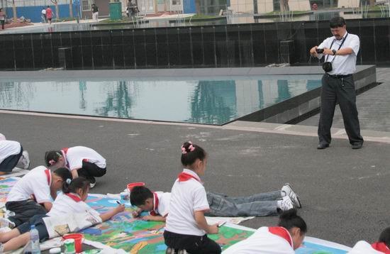长卷舒展,同学们就摆开架势,提笔作画。大家或蹲,或跪,或躺,时而专注勾线,时而沉着涂色,那样子,不失小小名家的风范!挥毫之间,马小承担的30米画卷——“繁华都市”“古城新景”“特色乡镇”三大系列完成了。这独特的构思,娴熟的技巧吸引了众多的目光,过往的游客群中不时传来啧啧的称赞声。电视台更有专业眼光,瞄准“特色乡镇”系列现场采访了四年级的沈睿和王雪琴同学。