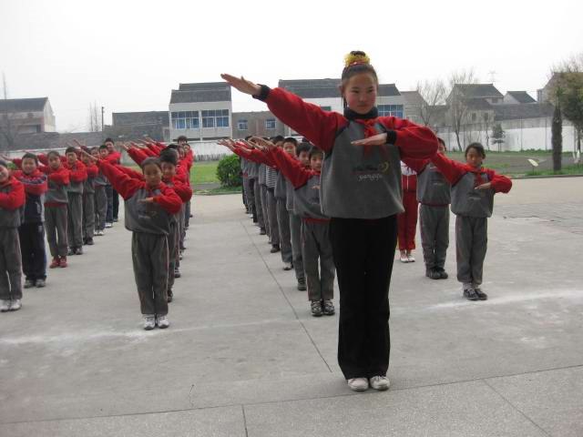我校学生是在上个学期开始学习新版广播操的。为了教学生做好广播操,老师们首先开始学习。由于学校没有专业的体育老师,老师们学习广播操遇到了很大的困难。一张图纸,一套音乐,全校教师齐上阵,男女老少学做操。