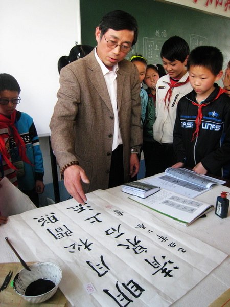 教室内,王文明老师正在给师生们上书法作品创作课。他向师生介绍了作品书写方法,详细介绍了横轴、斗方、竖幅的写法,注意点,还教给师生在宣纸上经营、布局的关键点,并现场示范了一幅楷书作品,一幅隶书作品。随后,一个个地手把手地教师生们布局、蘸墨、运笔,落款,忙得不可开交,师生们获益颇多。