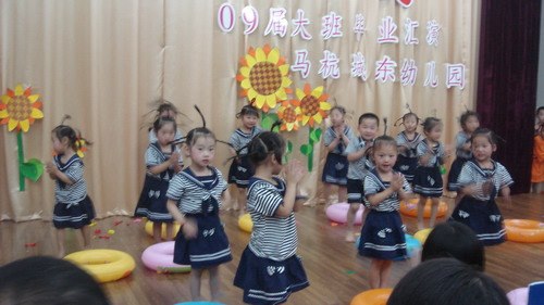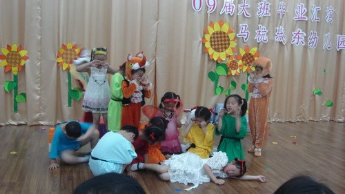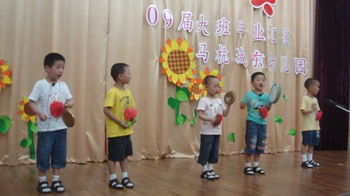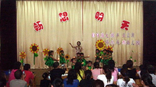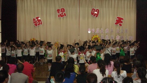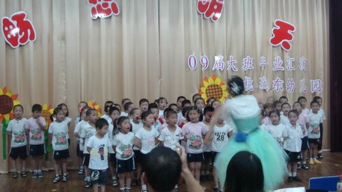 今天,马杭城东幼儿园大班的小朋友和家长欢聚一堂,在会议室隆重举行了“畅想明天——2009届大班毕业汇报演出”,演出活动在大合唱《歌声与微笑》中拉开序幕,节目内容丰富多彩,有舞蹈、京歌表演、英语童话剧、朗诵、亲子游戏、才艺展示等多种不同的表演形式,孩子们用优美的舞姿、稚嫩的歌喉、可爱的表演向家长和老师们表达了自己成长的快乐,赢得了家长们的阵阵掌声和声声祝福 。三年的朝夕相处已在师生之间建立起深厚的情感,节目中到处洋溢着浓浓的师生亲情。小、中班的小朋友也用精彩的节目来欢送大哥哥大姐姐。最后,活动在所有大班毕业生充满自豪而又依依不舍的毕业诗中圆满结束!