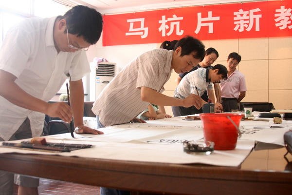 作为一所身处南田故里的百年老校——马杭中心小学,沿袭着特殊的文化优势,秉承着深刻的文化底蕴,我们更加深刻地认识到了书法教育的重要性以及建设一支高素质的书法教师队伍,对提高学校的书法教育教学水平的重要性。2009 年 8 月 18 日,马杭中心小学的班主任、语文教师集聚在会议室里,学习的热情就像这秋日的高阳一般炽热而渴切。常州市少年科学艺术宫主任、中国书法家协会会员、常州市书法家协会副主任卢海洲主任,常州市少年宫社会活动部主任、常州市书协副秘书长张军佳主任、江苏省书法家协会会员、知名书法家李国强老师亲临我校,与老师面对面,进行书法培训指导。
