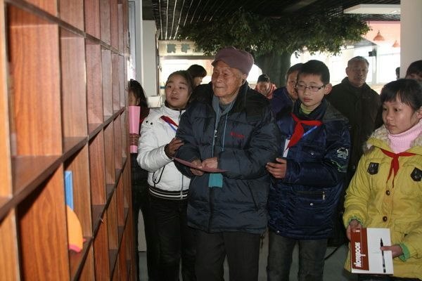参观完校园,邱校长心情激动地登上了三(1)班教室的讲台。站在昔日曾经挥洒过他的青春与汗水的三尺讲台上,他对孩子们提出了殷殷期望:你们是祖国的希望,今天又与你们站在一起,非常高兴。相信你们能认真学习,再创辉煌,为百年马小的到来留下最美的一笔。孩子们听了邱爷爷的话,纷纷表示要珍惜现在的学习条件,努力学习,拿出优异的成绩向邱爷爷汇报。孩子们知道邱爷爷最喜欢看书,特地准备了学校的画册、书籍等赠送给他,还把亲手制作的小礼物送给邱爷爷,祝他福如东海,寿比南山。