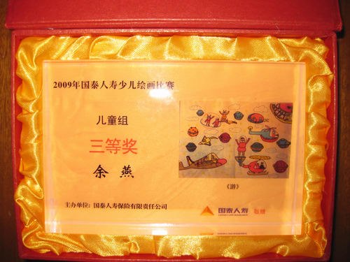 去年十月份,王飞老师组织部分学生参加了国泰人寿保险有限责任公司的绘画比赛。余燕、王紫君、蒲阮莉绘画作品喜获三等奖,并获得一份精美礼品,如下图,他们的绘画作品就刻在礼品上。