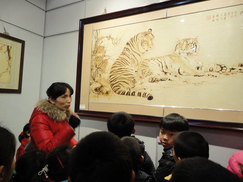 昨天下午,我校组织南田少儿书画社师生50多人,前往博物馆参观“百虎祥瑞——汪鹤鸣烙画艺术展”。