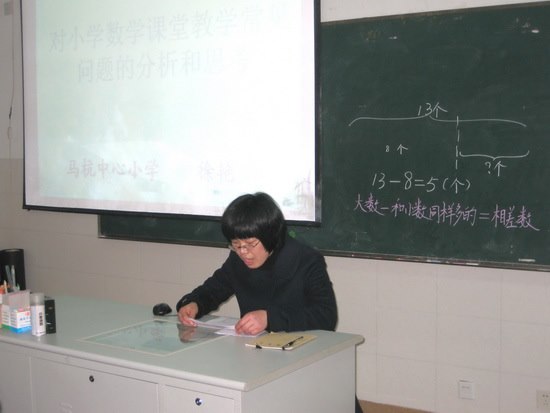 接下来,数学能力促进小组的徐艳老师结合平时教学中的一些现象和自己的思考,作了题为《对小学数学课堂教学常见问题的分析和思考》的讲座,她从情境创设、合作交流与小组学习、算法多样化等几方面展开,并结合一些典型的教学案例,通过正反比较,深度剖析了一些教学中常见的问题,使在座的每一位数学老师更加明确了新课程背景下如何构建有效、扎实的数学课堂。