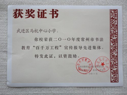 近日,武进区马杭中心小学获得了常州市教育学会书法专业委员会颁发的二0一0年度常州市书法教育“百千万工程”宣传报道先进集体的表彰,与此同时,我校蒋惠芬、蒋惠萍两位老师的书法作品在刘海粟美术馆一楼的东展厅展出,蒋惠芬、蒋正伟两位老师的书法作品在刘海粟美术馆的西展厅展出。