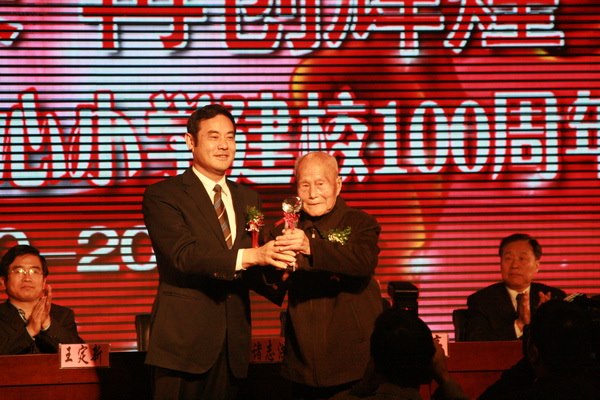 最后,区委常委、政法委书记、湖塘镇党委书记诸志洪先生为马杭中心小学中华人民共和国成立后第一任校长,与马小同龄的百岁老人邱恺元先生颁发了终身荣誉奖。