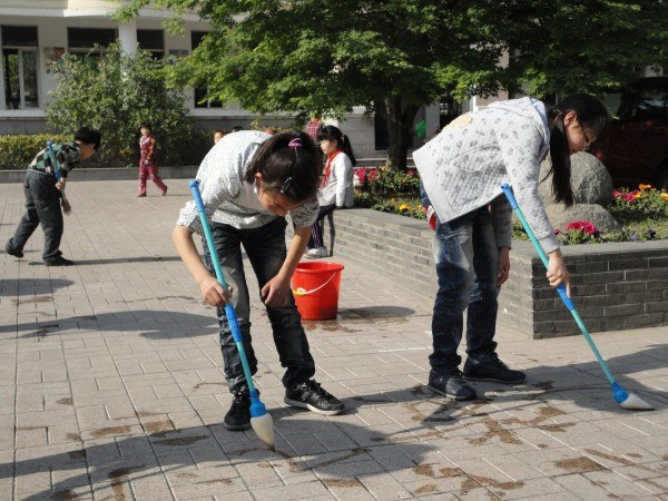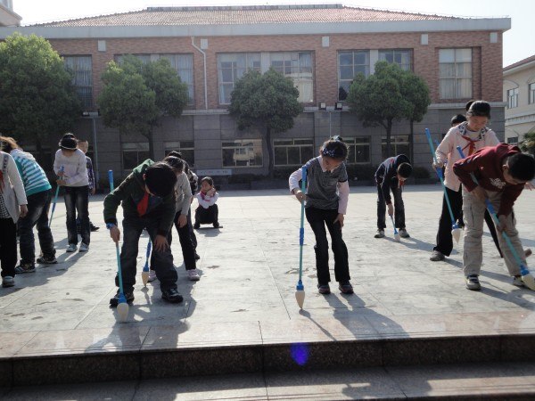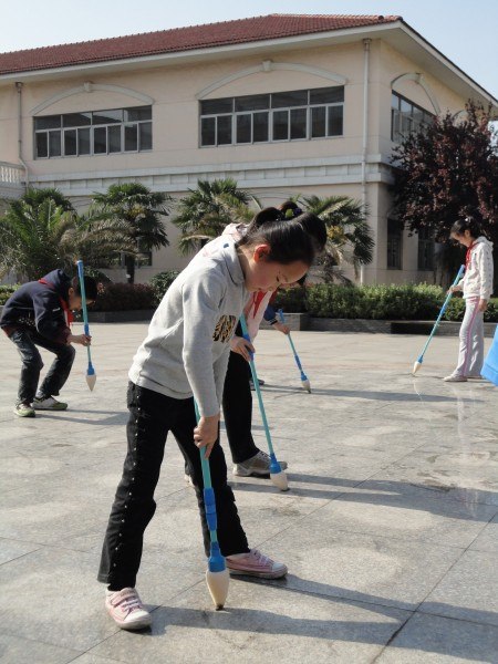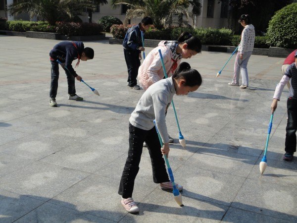 下午两节课后,马小校园多彩多姿的兴趣活动就展开了,您见过在地面上泼墨挥毫的人们吗?昨天,南田少儿书画社的小社员们真切地体会了一次大地当纸泼豪情的感觉。