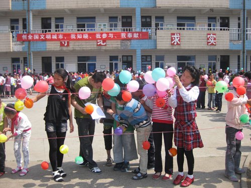惊喜三:一场热闹非凡的猜谜游艺活动。一只只五彩缤纷的汽球,一条条新奇有趣的谜语,学校老师们为同学们布置出了一个五彩斑斓的“球”谜大世界。同学们在看完电影后纷纷涌向操场,争先恐后地奔向了汽球,猜起了上面的谜语。一张张可爱的笑脸上的表情顿时丰富起来。有的皱起了眉头冥思苦想,有的猜出了谜语暗暗高兴,大多数同学因为得到了气球和奖品欢呼雀跃起来。孩子们的眼中闪烁着兴奋的光芒。