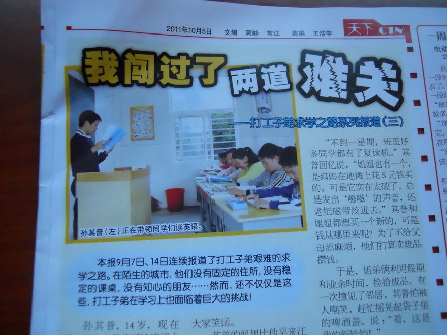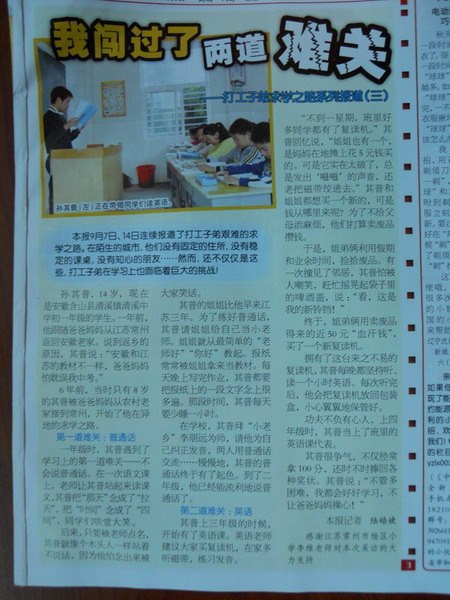 在《中国少年报》第2784期上,登载了这样一个故事。外来工子弟孙其普在异乡求学时,克服了普通话和英语学习的两道难关,取得优异成绩。这个故事正是发生在孙其普就读于杨区小学期间。我相信:他的刻苦努力、追求上进,一定会时时激励着更多和他一样的孩子在艰苦的条件下不畏困难、勤奋学习。
