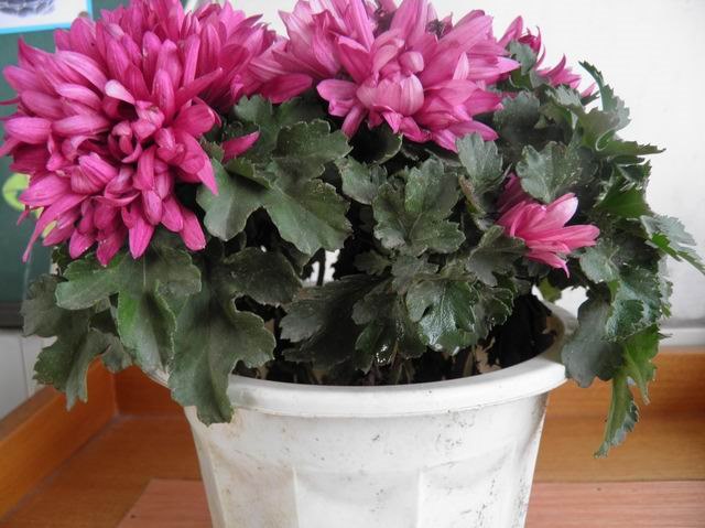 有人可能认为,菊花争奇斗艳,是那么的骄傲。可我认为,我们班的那盆菊花,美丽而又谦虚。瞧,这盆菊花是由五朵紫红色的大花组成的。远看,像五个紫红色的绣球镶在绿色的叶子上,高贵而又淡雅。它长时间地被太阳晒,花瓣都卷了起来,像一个害羞的小姑娘蜷缩着身子,但摸上去仍很舒服。仔细闻,被花瓣包裹着的黄色小花蕊散发出淡淡的清香,真是沁人心脾啊!它默默地把自己的“芳香”带给每一个人,我们怎会不爱它呢?(张凝露)