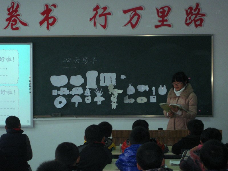 接着胡小洁老师执教了二年级上册《云房子》第二课时。一个好的开始是成功的一半。刚开始,胡老师就用课件展示了流动的云朵,哗啦啦的下雨声,轰隆隆的雷声,拍打翅膀的小鸟……通过视觉、听觉等多种感官的参与,使学生很快进入教学情境,仿佛身临其境。在教学过程中胡老师抓住文中关键段落,反复诵读理解。并且通过实物向学生展示了“傻傻的大冬瓜”、“美美的花儿”“很高的大楼房”、“很宽的大礼堂”……接着引导孩子自己动手画一画、撕一撕、说一说,培养了孩子欣赏创造的能力,同时让课堂也充满了趣味。胡小洁老师以亲亲切的教态,扎实的基本功,出色的课堂驾驭能力,以及对教材的解读和精心设计得到了老师们的肯定。