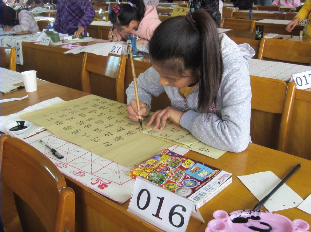 我校南田书画社5位小社员参加了上午第一场次的比赛。虽然我校这次参赛的五位小社员有的是首次参加这样级别的比赛,但他们仍能表现得从容不迫。特别是吴帆同学,她的参赛内容多达81个字,要在一小时之内写完并落款盖章,需要极大的勇气和定力。这个时候,平时的认真练习帮了大忙。在赛场上她做到了沉着镇定,一丝不苟。她的作品得到了评委的高度评价和肯定,获得了首场比赛120人中的最高分,位列第一。杨佳同学也不甘落后,紧紧跟随,位列第二。