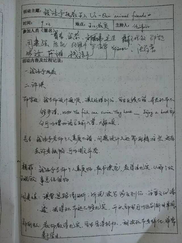 9月23日上午,英语教研组全体老师聚集在马小五(3)班,聆听了由钱洁予老师执教的译林版五年级上册Unit3 Our animal friends第一课时。在教学中钱老师注重了对学生学习兴趣的培养与维持。课堂节奏明快,语言训练规范。整个课堂设计通顺,板书精致,思路清晰,听、说、读、写四大部分涉及到位,注重文化渗透,课文部分处理到位,让学生在玩中学,注重了递进层次性、趣味互动性和动态开放性。A板块的学习更是突出了对语篇整体意识的引导和建构,同时注重了学生的语音语调的训练。过渡衔接自然有创意,有效地激发了学生的学习兴趣学生融入其中,体验深刻,课堂气氛活跃,师生乐在其中。