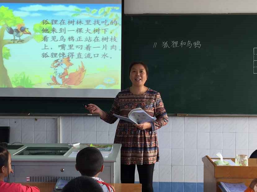 首先,由蒋素芬老师执教了《狐狸和乌鸦》第一课时。课一开始,蒋老师就以飞扬的激情、生动的教学设计牢牢抓住了学生,听课老师也都十分叹服于她的精气神。蒋老师的第一课时十分扎实有效,字词教学从平面走向立体。课文中 “一”字多音,“一棵大树、看了一眼、刚一开口”中“一”读第四声,“眼珠一转、一片肉、一溜烟”中“一”读第二声,孩子读得兴趣盎然、津津有味。蒋老师在教学生字时能结合字的特点和课堂生成进行多样拓展,如学生组词“眼珠”,教师及时追问“怎样的眼珠”?教学“赔” 时引导学生说出“损坏别人的东西要赔偿”、“不小心踩了别人的脚要赔礼”等。真正做到了向课堂要质量,也将无痕德育落到了实处,充分体现了老教师深厚的教学功力。