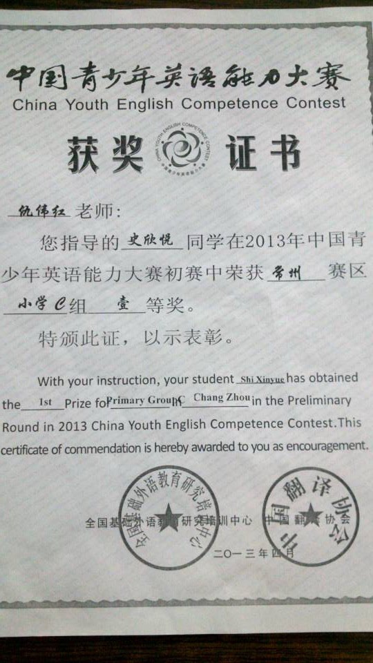 仇伟红 指导学生比赛荣誉证书