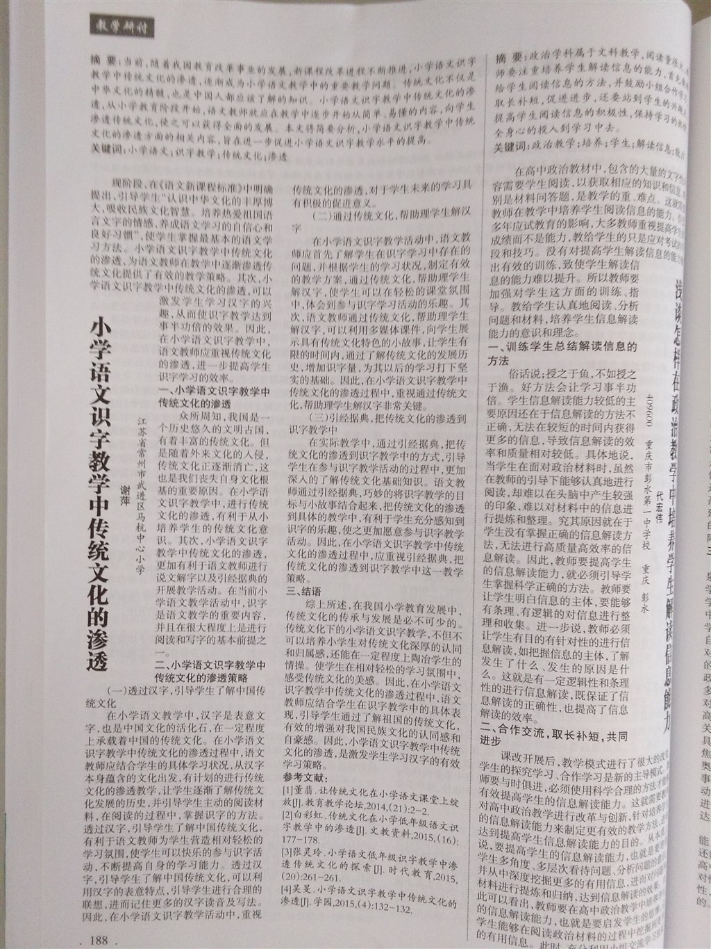 谢萍论文发表《小学语文识字教学中传统文化的渗透》