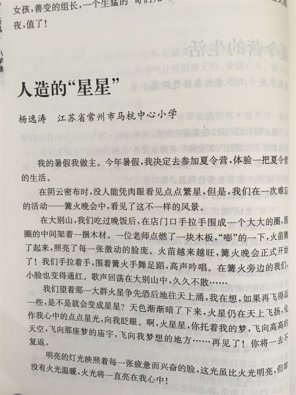 张颖同学的《我和南大有故事》真实地记录了自己第一次接触“南大”的深刻感受,写了南大的美景,忆了南大的作文课,思了作家——谭凤霞,更表达了自己七年后会在南大继续自己的故事。杨逸涛同学的《人造的“星星”》细致记叙了自己在夏令营中最喜爱的“篝火晚会”,大家围着火苗唱呀、跳呀、喊呀,看着火星不断往上蹿,寄托着自己美好的梦想不断高飞!