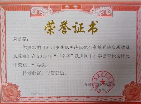 周建强老师 撰写的论文“利用少先队阵地优化生命教育的实践途径及策略”获武进区德育论文一等奖