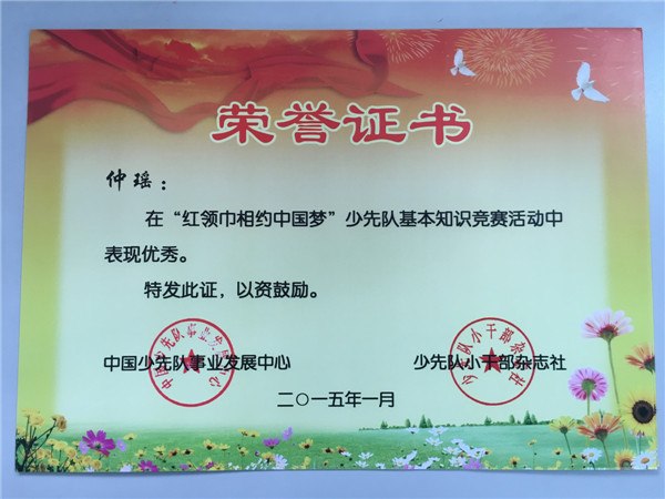 仲瑶获全国“红领巾相约中国梦”少先队基础知识竞赛优秀个人奖