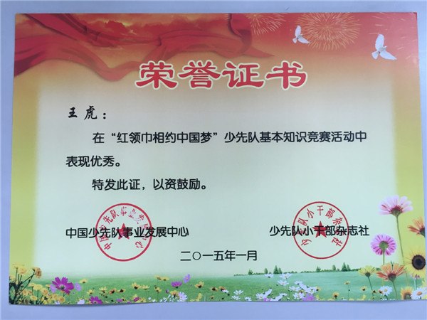 王虎获全国“红领巾相约中国梦”少先队基础知识竞赛优秀个人奖