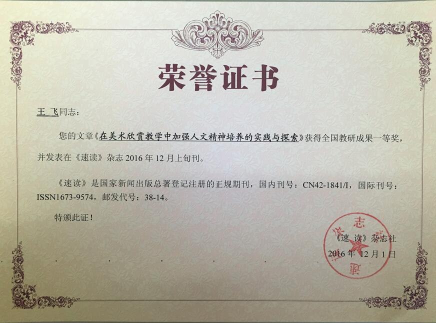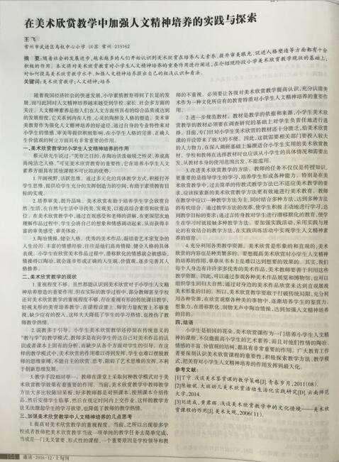 王飞老师发表文章《在美术欣赏教学中加强人文精神培养的实践与探索》