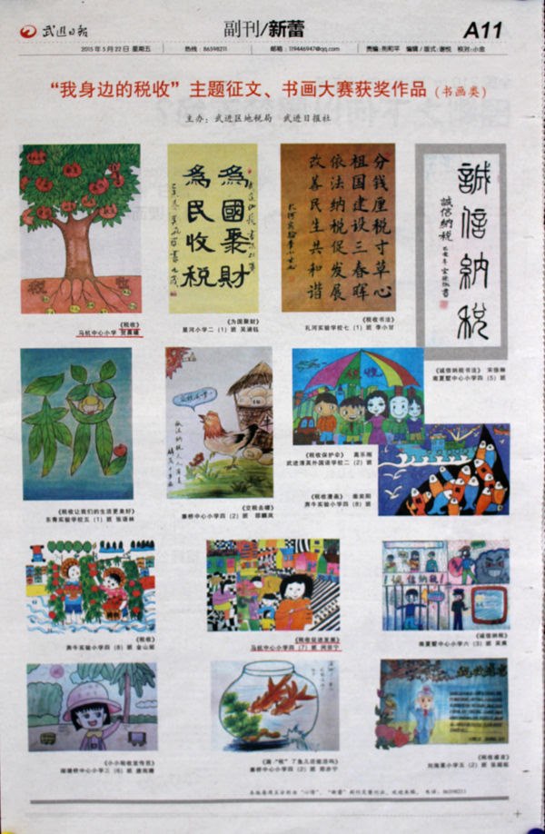 2015年5月7日,《书法报》书画教育专栏第9期选登了由我校书法名师蒋惠芬老师辅导的8幅学生书法作品;2015年5月22日,此专栏第10期又选登了我校王飞老师和马璟老师辅导的学生绘画作品共11幅,这两大喜讯激励着我们马小师生更加努力去践行常州书法教育百千万工程。