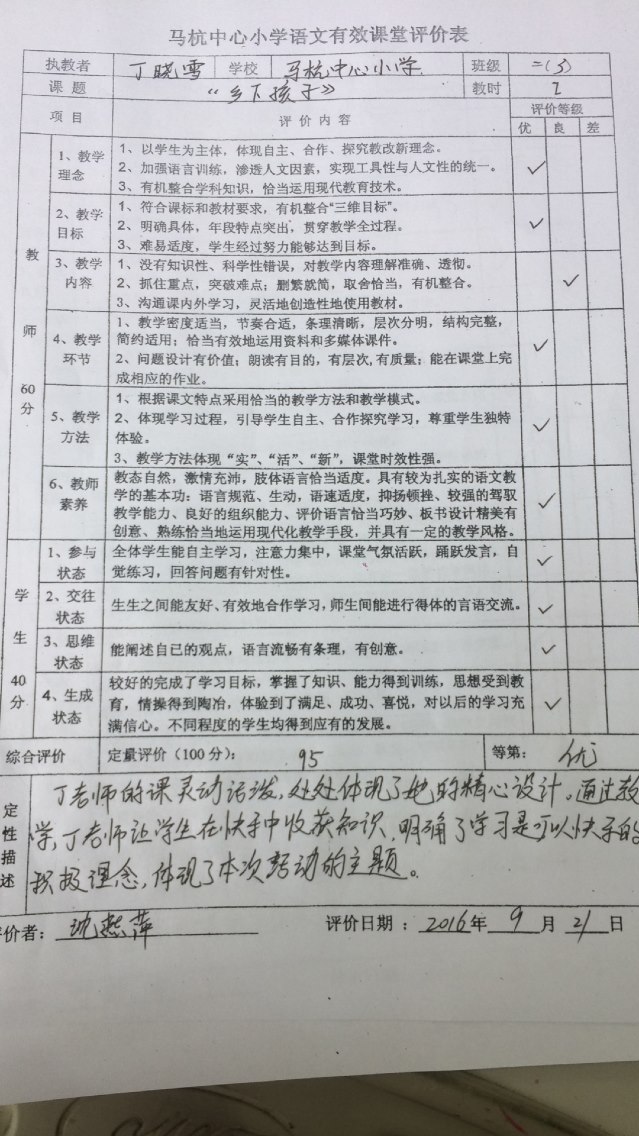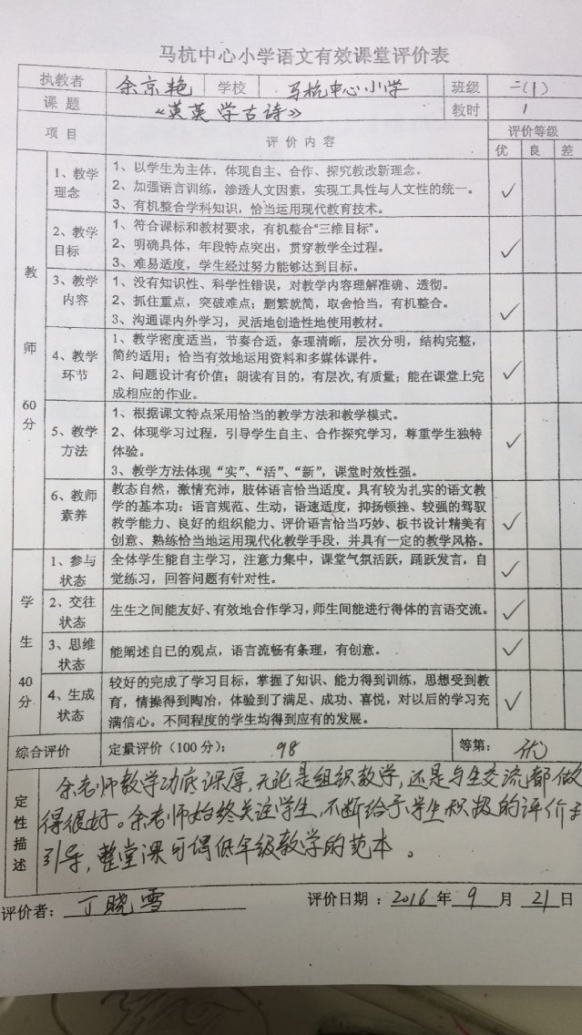 余京艳老师和丁晓雪老师教授的两节课,备课认真,课件精美,学生快乐地参与其中,并在潜移默化中得到了积极人格的培养,彰显了本次教研活动的主题。首先是余京艳老师教授《英英学古诗》第一课时,余老师不愧是我校功底深厚的骨干教师,上的课可谓是低年级语文第一课时的范本。课堂上,无论是组织教学、还是与学生交流,余老师都做得很好。最可贵的是,余老师始终关注着学生,不仅课堂常规抓得特别好,而且不断地给学生积极的评价和引导,这正是低年级语文课堂中培养学生积极人格的有效方法。正因为余老师一直这样教导着、暗示着,二(1)班的孩子们积极向上,非常可爱。第二节课是丁晓雪老师教授的《乡下孩子》第二课时,丁老师的进步很大,整个课堂过程流畅、灵动。丁老师的体态、表情到位,善于倾听学生的回答,并做出了恰当的评价。整节课在快乐中进行着,让孩子们学到了知识,收获了快乐,更明确了学习是可以快乐的积极理念。