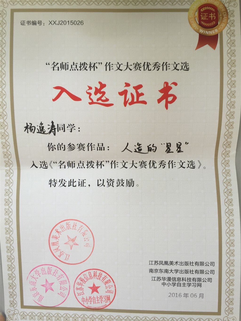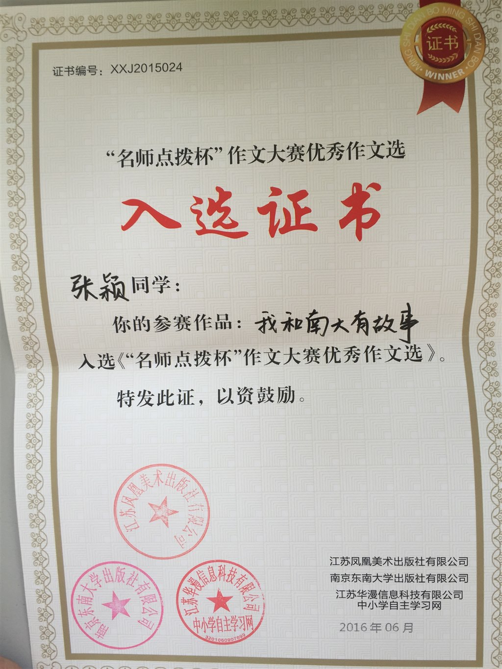 由江苏凤凰出版传媒集团、南京大学文学院、扬子晚报、中小学自主学习网等单位联合举办的第三届“名师点拨杯”作文大赛如期拉开了序幕。该项作文大赛几年来共收到了来自全国5万余篇佳作,参赛学校多达1000所,在江苏乃至全国产生了一定的影响。常州市武进区马杭中心小学张颖同学的夏令营习作《我和南大有故事》和杨逸涛同学的夏令营习作《人造的“星星”》经过组委会层层筛选,严格审核,最终入选《“名师点拨杯”作文大赛优秀作文选》。