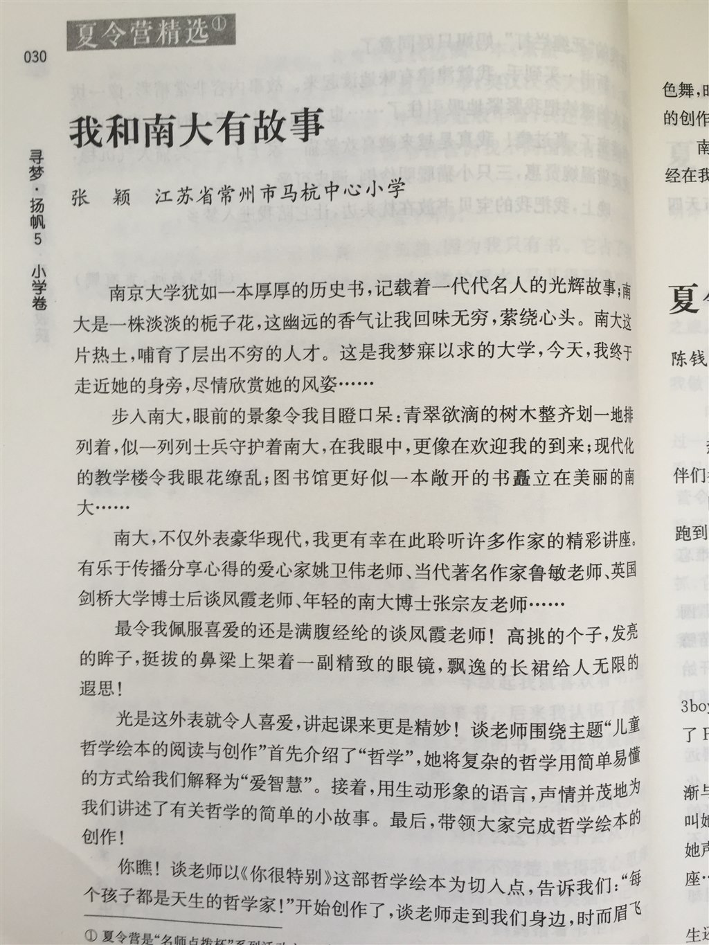 张颖同学的《我和南大有故事》真实地记录了自己第一次接触“南大”的深刻感受,写了南大的美景,忆了南大的作文课,思了作家——谭凤霞,更表达了自己七年后会在南大继续自己的故事。杨逸涛同学的《人造的“星星”》细致记叙了自己在夏令营中最喜爱的“篝火晚会”,大家围着火苗唱呀、跳呀、喊呀,看着火星不断往上蹿,寄托着自己美好的梦想不断高飞!
