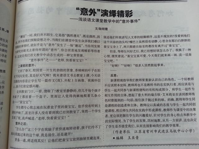 “邂逅”一词,我们并不陌生。它是指“偶然遇见”。既是偶然,因此,并不在我们预期设想之中。当我们在课堂中发生众多我们难以预期的事情时,就似乎是与“意外”发生了一场“邂逅”。当你用发展与研究的眼光去看待所谓的“意外”,你会欣喜地发现精彩等待着你,这就是我们语文教学中动态生成的一种宝贵资源。