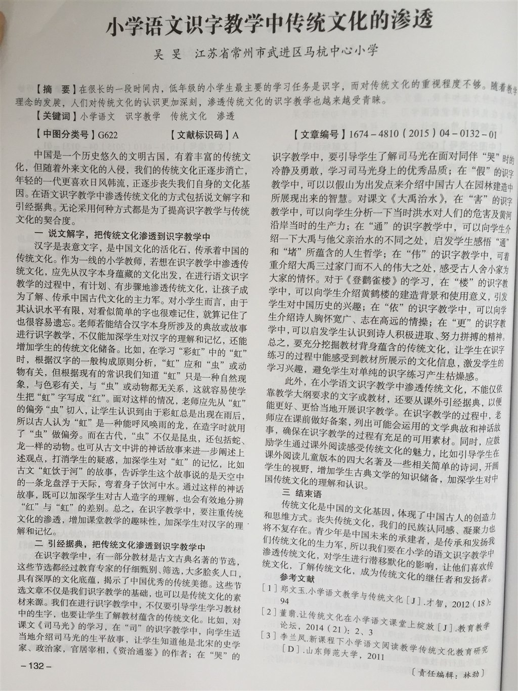 吴旻发表文章《小学语文识字教学中传统文化的渗透》