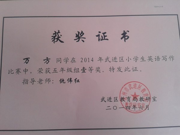 经学校选拔,我校五年级万方、赵伟娜,六年级余朱骏、曹文涵参加区英语写作比赛,获得了一、二等奖的好成绩。