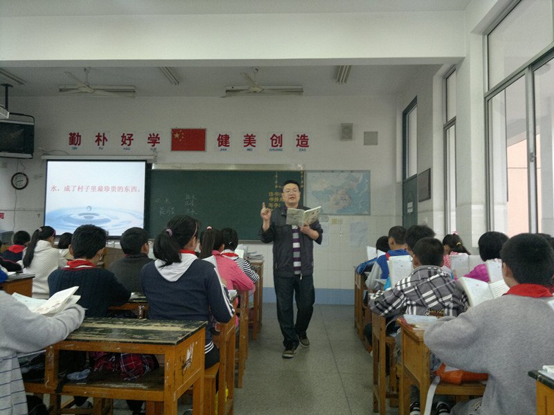 宋主任执教的是27课《水》第一课时。教学伊始宋老师便开门见山引出文章的中心句“水,成了村子里最珍贵的东西。”而后紧扣中心句展开了教学。教学中宋老师充分预设,为学生扫清阅读障碍。如本课虽然生字不多,但有些词学生理解起来有一定的难度,如“水窖”,多音字:扇。宋老师在充分预设的基础上,重点提示带有这些字词的句子,帮助学生读正确,读通顺,并在具体的语言环境中区别多音字的读音。宋老师教学语言生动,善于启发学生想象。如在交流“百里挑水”的情景时,让学生在充分自读的基础上,引导抓住数量词感受家乡严重缺水的情景,而后颇具匠心创设语言训练情境:“假如这是电影里远远的镜头,你看到了什么?将镜头渐渐推近,你又看到了什么?”学生通过适度的想象拓展,将文字化成了一幅幅形象生动的画面,在想象中感受人们取水的痛苦,体会水的珍贵,使学生“既得其意,又得其言”。