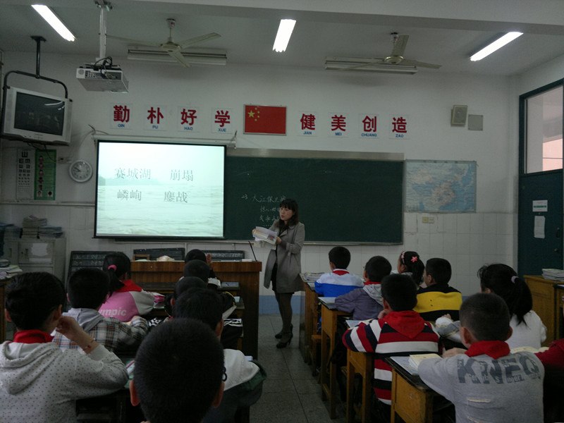 周校长执教了25课《大江保卫战》第一课时,她用充满激情的语言诠释了文本为我们呈现的壮烈画面。整堂课语文味道浓烈,从字词教学到语句朗读再至概括段意无不匠心独具,如理解词语时方法多样,根据偏旁理解“嶙峋”“铮铮铁汉”,联系上下文理解“鏖战”,找同义词理解“崩塌”等;在用小标题概括段意前先辅以关键语句的朗读,从而教给学生概括的方法;特别是在第一段的教学中播放了当年长江流域洪水肆虐的场面,适时有度的拓展将学生带入到特定的情境中,有力地渲染了课堂气氛,无需多言,立刻就使学生感受到了情势的危急,激起了学生的情感,唤起他们探究的欲望,使之怦然心动,为下文“险中见英雄”做好了情感的铺垫。正如德国教育家斯多惠说:“教学艺术的本质不在于传授的本身,而在于激励、唤醒、鼓舞”。
