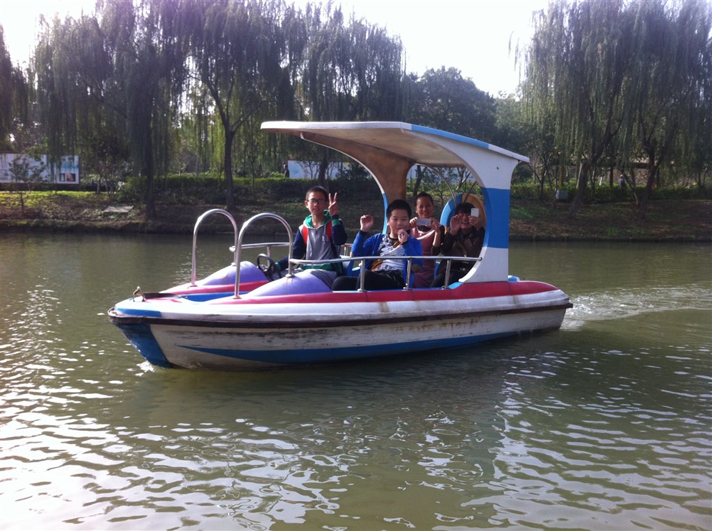 圩墩公园蓝天碧水,杨柳依依,我们一行18人个个踏上小船,泛舟湖上,微风泛起阵阵涟漪,映出了孩子们张张笑脸,此时的孩子们如出笼的小鸟,或飞翔,或摇曳,或停留,或跳跃。一切的一切都是那么开心、快乐,连这里的空气都是甜的。