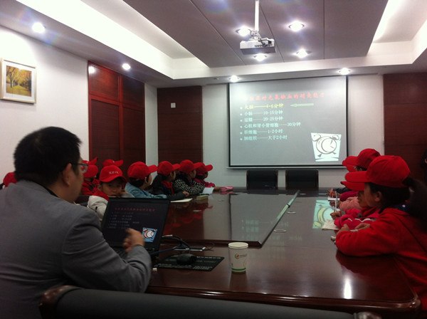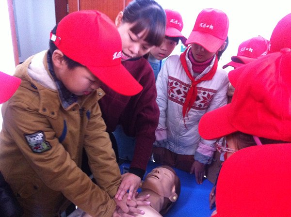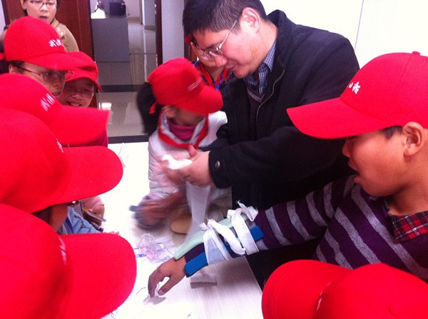 下午2点,小记者们兴致勃勃走进南院,受到了武进医院南院领导、武进日报社谢编辑的热情招待。首先,大家认真地聆听了急诊科冯斌主任关于《意外伤害的处理》和尹进南副主任关于《外伤现场处理原则》的专题讲座。冯叔叔和尹伯伯用朴素的语言、鲜活的事例深入浅出,详细介绍了伤害处理的步骤、方法,为小记者们上了生动的一课。小记者杨逸韬、诸葛浩杰还和医务工作人员进行了热烈的互动,解开了心中的疑惑。接着,在冯叔叔、尹伯伯、谢阿姨的陪同下,小记者们参观了模拟急症室。护士长阿姨娴熟的技术、热心的讲解,医疗仪器精良的装备、先进的科技又带给小记者们一份又一份的惊叹与感动。特别是心肺复苏体验,再次让小记者们感受到了生命的珍贵和医学的严谨,医者的重要,大家禁不住为身旁的医生叔叔、护士阿姨们送上最最崇拜的掌声。讲解结束,小记者们一个个跃跃欲试,大家排队轮流上阵体验急救、护理的操作过程。“这个手怎么放呢?先要垂直,在乳线正中的地方,垂下来,然后立起来,利用上半身的力量往下按,来,准备,开始。01、02、03、04……”其他小记者一边观摩,一边饶有兴致地提醒。