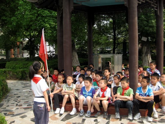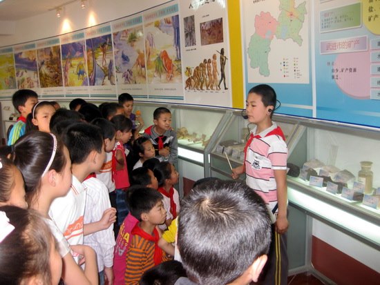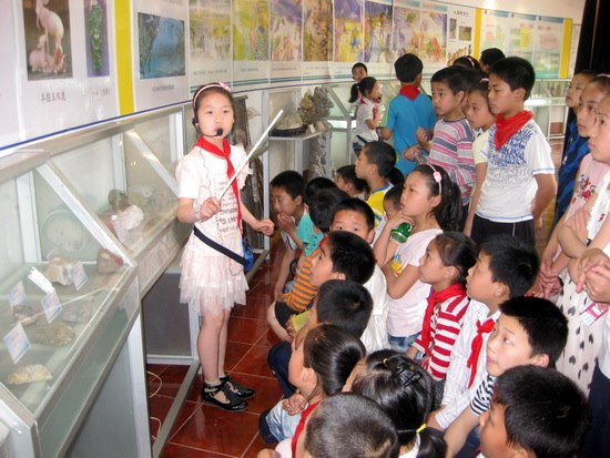 来到城东小学,大队辅导员唐文亚老师热情地带领大家参观地学环境科普馆。一走进馆内,里面的图片和物品立即吸引了孩子们的眼球。科普馆内共有29块展板,分五大板块,展示了地球的层圈结构、岩石的类型、矿物、生命的演化历程、常州的资源分布等。馆内还有一个地面沉降模型,形象生动地演示了地下水的开采情况导致的地面沉降现象。此外,还陈列了恐龙蛋化石、贵州龙化石、玉石等共计107件珍贵矿石标本。那究竟什么是基岩标呢?在科普馆外的小花园内,队员们看到了它的真面貌。所谓基岩标,就是将观测井直接打到基岩上,然后把一根不锈钢标杆固定在基岩上,通过观测地面与标杆之间的位移变化,来观测地面的沉降情况。基岩标的建成对苏锡常地区农业基本建设、城镇建设规划、防洪抗洪设施建设等提供了重要的科学依据,发挥积极的服务功能。在整个参观过程中,这里的小讲解员们给我们留下了深刻的印象。他们神态大方,娓娓动听的讲解更是让队员们清楚地了解了地球的演化过程,了解了基岩标,了解了科普馆。