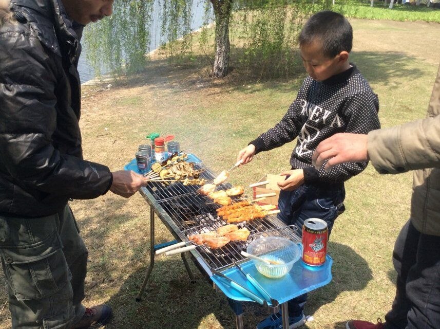 一到目的地,家长们就分组开展活动,忙着支烧烤架、生火、铺桌布,孩子们也不闲着,帮忙拿自带的食材......好一番热闹景象!在一片扇风点火、烟熏火燎之后,炭炉准备就绪。爸爸们把准备好的各类食材如鸡翅、肉串、肉丸、香肠、金针菇、土豆片、茄子等相继放到烤架上,刷上油,在炭火上来回翻转,不一会儿就香气扑鼻了,孩子们闻香而来,拿着盘子、筷子,争先恐后地夹起了自己爱吃的菜。