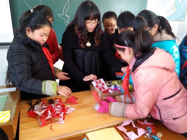 随后,她从铁盒里拿出一个立体的春字,说:“这是我的一件作品,十分简单,当成摆设最合适不过了。"接着又拿出了几件好看的雪花剪纸,看的同学们眼花缭乱,不时啧啧称赞。最后,她拿出镇山之宝“大纸花”:由六片镂空花瓣组成,每片花瓣都精心雕刻,每一处细节都无可挑剔,制成挂件非常漂亮!