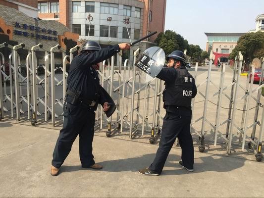培训中,总务处盛永泽主任首先明确了反恐防暴技能对校园安保的重要性,其次讲解了防刺服、防割手套、盾牌、警棍、辣椒水、防暴叉等专用反恐防暴器材的使用方法、安全注意事项及攻防技能。其中包括盾牌警棍配合训练、防暴钢叉使用训练、单兵对抗训练、多人配合训练、多人制服训练等突发性事件的应急处置方法。最后,王警官对安保人员进行了仪容仪表、队列队形的训练,并提出了平时训练的要求及注意事项。